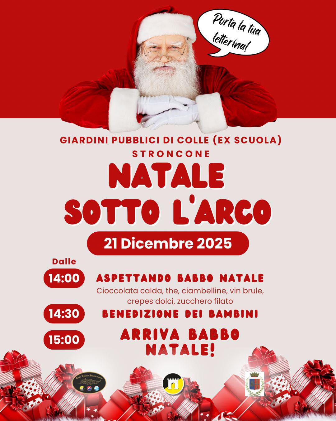 Il 21 dicembre 2025 ai Giardini Pubblici di Colle (ex scuola) a Stroncone torna Natale sotto l'arco.Un momento semplice e tradizionale per vivere insieme l’atmosfera del NatalePrevista anche la benedizione dei bambini e, a seguire, l’arrivo di Babbo Natale.
